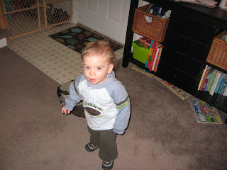 Lincoln you are BUSY with a capital B. You have no time or patience for being held back when the world is out there waiting for you to figure it out. You step out the front door in the morning on our way out to day care/work and I lock the door as quickly as possible, because you are racing for the street. I think if you could walk to where ever we need to be you would. (Now, don't panic, we live on a cul-de-sac and here is no traffic. I am right beside you.) Dad took you for a walk on Sunday and you wandered the high school track and threw tennis balls and you loved it. Today, Dad brought you by work so I could see you and you went into everyone's office to say hello, but you were too busy running around and playing with Mr. White's trucks to show off all of the talking you do. When I tried to pick you up to talk to you, you arched and fussed, flailing a acting like a wet noodle until I put you down to explore some more.
